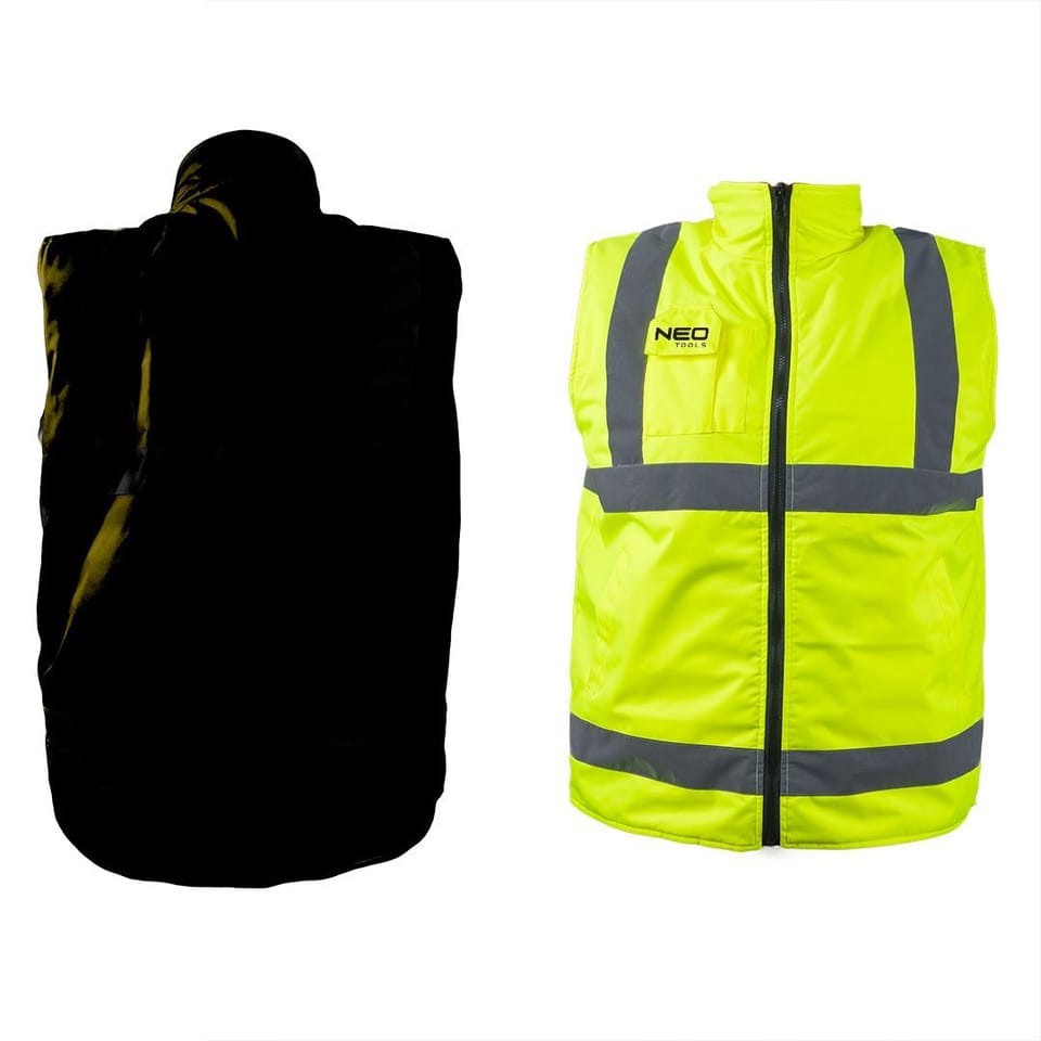 Insulated working tank top, double-sided NEO (ref 81-520-XXL) with intense visibility, is a practical solution that increases the safety of the user, consisting in signaling his presence, in all daylight conditions and in the dark in the lighting of vehicles. The outer side of the tank top is made of durable waterproof fluorescent material and reflective elements, ensuring visibility corresponding to class 2, in accordance with the requirements of PN-EN ISO 20471: 2013. The inner side made of black fleece, high stand-up collar and elongated back provide warmth and comfort of use in cold weather. The tank top has a pocket for the smart NEO brand meets the expectations of professionals.ona and a pen on the warning side and two pockets in the lower part on each side. The versatility of the tank top will be appreciated by professional drivers, construction workers and ordinary users. The quality guarantee is the European CE certificate.