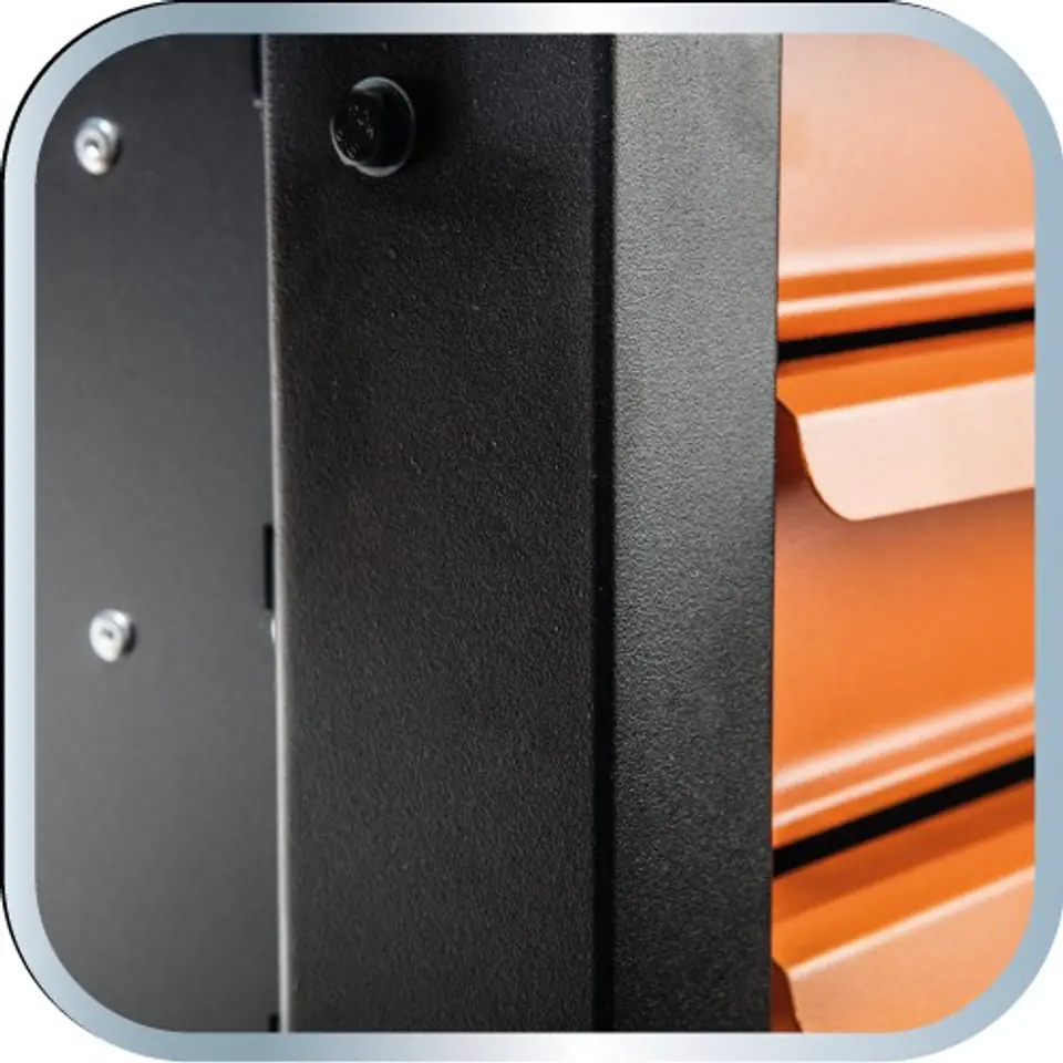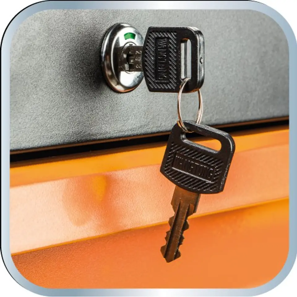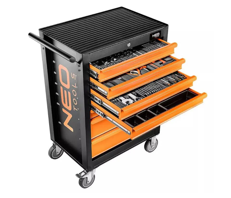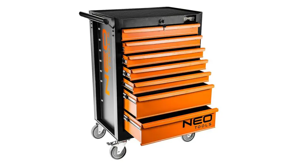 NEO tool cabinet with dimensions of 680 x 460 x 1030 mm. The cabinet has 7 practical drawers for tools, closed with a central lock. All drawers are fully openable, have ball guides, ensuring long-term, smooth and reliable operation. The drawers are secured with a ratchet lock, which ensures the protection of the environment during transport. The surface of the worktop is covered with a rubber lining, resistant to oil and grease. Five-inch, quiet, swivel wheels make it easy to maneuver the cabinet and are additionally equipped with a brake. Load capacity of the cabinet 280 kg. The cabinet is equipped with a handle that makes it easy to drive. The reliability of the product is confirmed by a 25-year warranty. In addition, it is equipped with inserts with popular tools. The NEO brand meets the expectations of professionals.