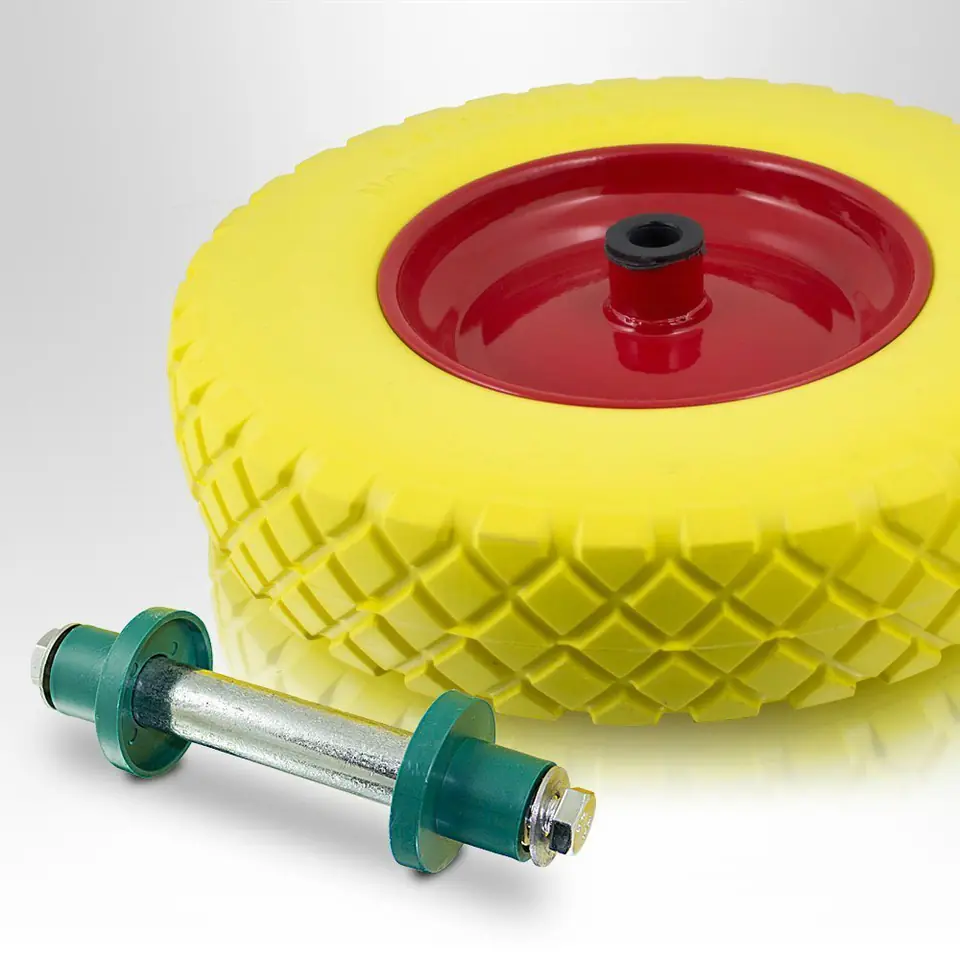 The new tubeless tyre, ankle tread plus axle will provide a stable ride, a much higher payload and a longer service life. Universal size fits 80% of wheelbarrows available on the market. Wheel filled with polyurethane, rim made of strong sheet metal with ball bearings. Set with axle! High-quality materials will allow for long-term use.