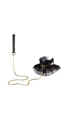 Materiał: skóra, tiul, stop cynku Długość: 24 cm Szerokość części skórzanej: 5 cm Szerokość tiulowych falban: 7,5 cm Regulacja: 16 cm - 19 cm