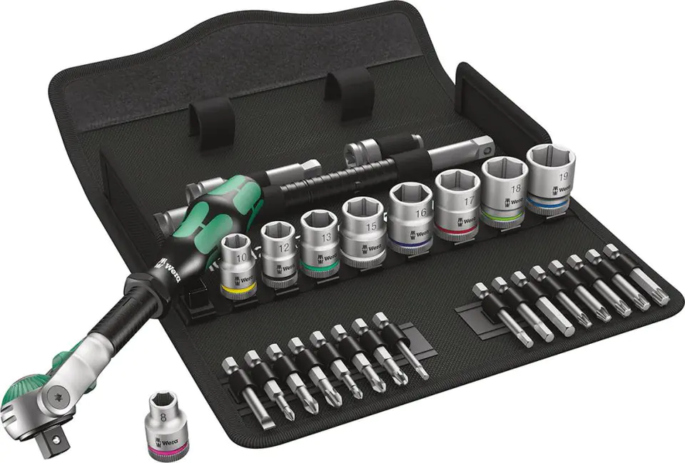 Design: with ductile hard bits and caps. The Zyklop ratchet combines the advantages of 5 different types of rattles and thanks to its special design ensures very fast work. The ratchet head is rotatable and can be closed in 5 different positions (90°, 75° in both directions and 0°) using a switch on both sides. Switching to the right and left and releasing the caps is possible in any position. 72 teeth, return angle 5°. It allows you to twist connections with bits and caps using only one tool. Delivered in a compact textile pouch that protects sensitive surfaces.
