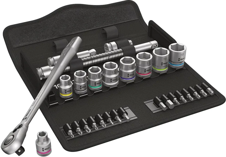 Execution: Chrome vanadium steel tools. Metal ratchet made of chrome-molybdenum steel, forged. Very narrow, with a long lever for good access in confined spaces and for the transmission of high torques, the ball retainer ensures a secure seat of the cap. Small weight for increased mobility, high strength. Delivered in a compact textile pouch that protects sensitive surfaces.