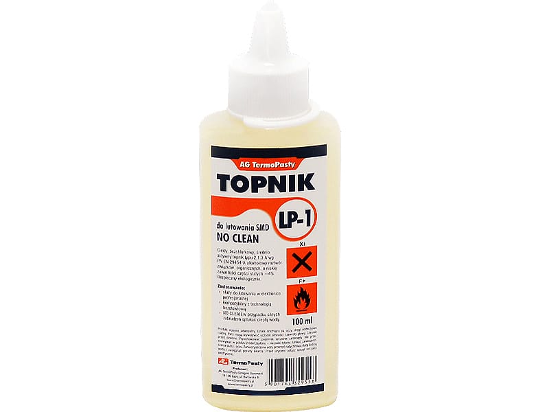 Ciekły, bezchlorkowy, średnio aktywny topnik typu 2.1.3 A wg ISO 9454-1 będący alkoholowym roztworem związkw organicznych, o niskiej zawartości części stałych ~4%. Bezpieczny ekologicznie. Przeznaczony do zmechanizowanego lutowania płytek drukowanych na podwjnej fali spoiwa w montażu powierzchniowym. Właściwości fizykochemiczne:- Wygląd: przeźroczysty o barwie lekko słomkowej- Zapach: ostry alkoholowy- Rozpuszczalność w wodzie: częściowa z powstaniem osadu- Inne rozpuszczalniki: toluen, etanol, metanol, heksan, 2- propanol- Aktywność metodą statyczną w tem. 250C: -pow. rozpływu stopu Sn60Pb40 ≥ 206 mm2- Zawartość halogenkw: 0 % - PH ( 1% roztwr wodny ): 3,34- Zawartość subst. nielotnych: 3,81 % - Gęstość w temp. 20C: 0,80 g/cm3- Opakowanie: oliwiarka 100mlStosowanie:Topnik możemy nanosić na elementy lutowane metodą pianową, falą topnika, natryskiem, zanurzeniem lub za pomocą pędzla. Pozostałości po tym procesie nie wykazują oddziaływania korozyjnego i nie wymagają usuwania.