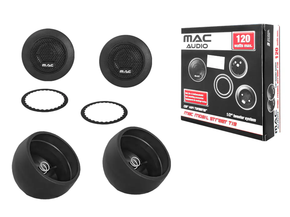 Głośniki MAC MOBIL T 19Niemiecka firma Mac Audio liczy już sobie 25 lat i cieszy się w branży doskonałą reputacją. Producent doskonałego nagłośnienia jest jednym z najbardziej utytułowanych specjalistów od samochodowych głośników i wzmacniaczy. Firma ceniona jest szczególnie przez profesjonalne firmy montażowe, które chętnie używają jej produktów. Na popularność Mac Audio zapracowało drobiazgową kontrolą jakości i wyśmienitym zrównoważonym brzmieniem.Dane techniczne:Głośnik wysokotonowyRozmiar głośnika: 13 mmMoc Max: 60 WMoc RMS: 30 WSkuteczność: 90 dBImpedancja: 4 OhmPasmo przenoszenia: 3000 – 24.000 Hz