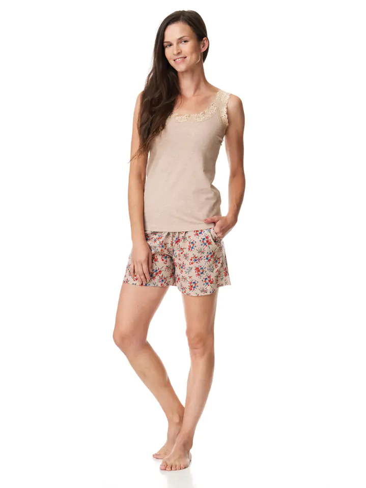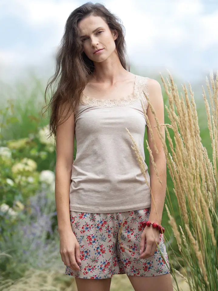 Piżama damska wykonana z wysokiej jakosci bawełny. Bluzka gładka na szerokim ramiączku, wzorzyste krótkie spodenki. Skład: bluzka 95% bawełna, 5% elastan, spodenki 100% bawełna.