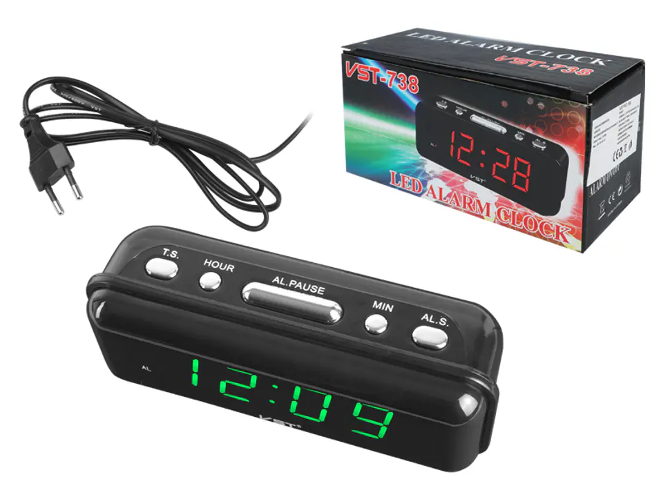 VST-738 to budzik zasilany sieciowo, przeznaczony do pracy ciągłej w stałym miejscu, na przykład na szafce nocnej. W razie przerwy w dostawie prądu urządzenie posiada dodatkowe, bateryjne źródło zasilania (2 x AAA, niedołączone do zestawu) w celu tymczasowego podtrzymania godziny w pamięci budzika.