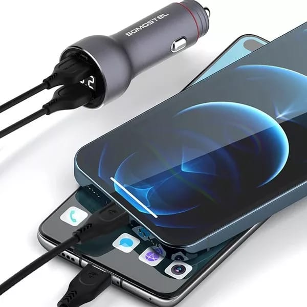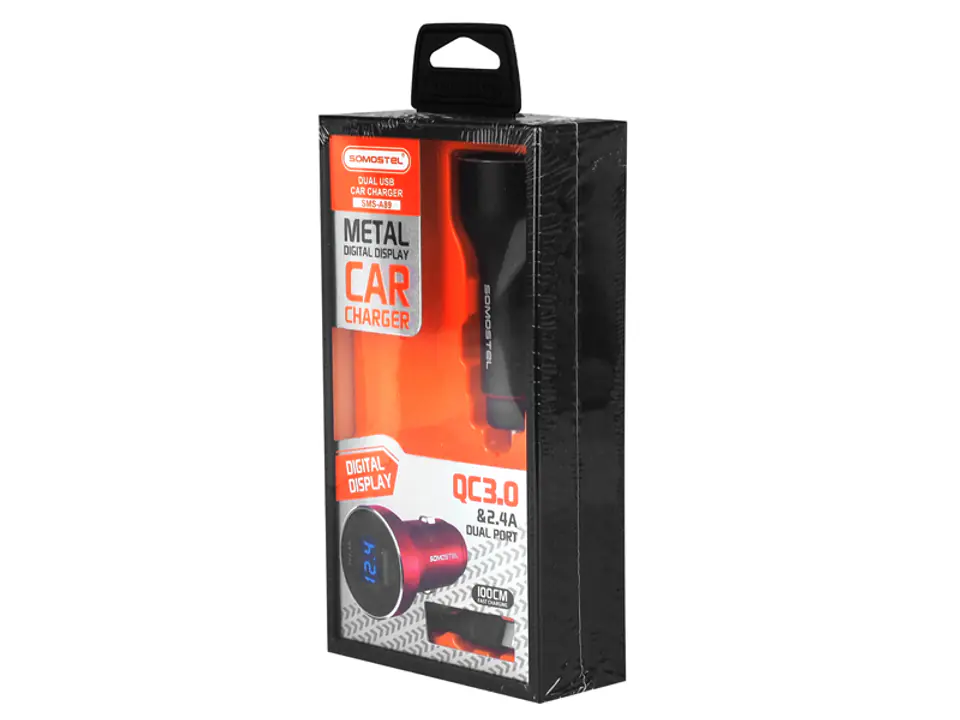 ŁADOWARKA SAMOCHODOWA SOMOSTEL 5A/30W, 2xUSB + MIERNIK, KABEL IPHONE CZARNA, SMS-A89, QUICK CHARGER 3.0.