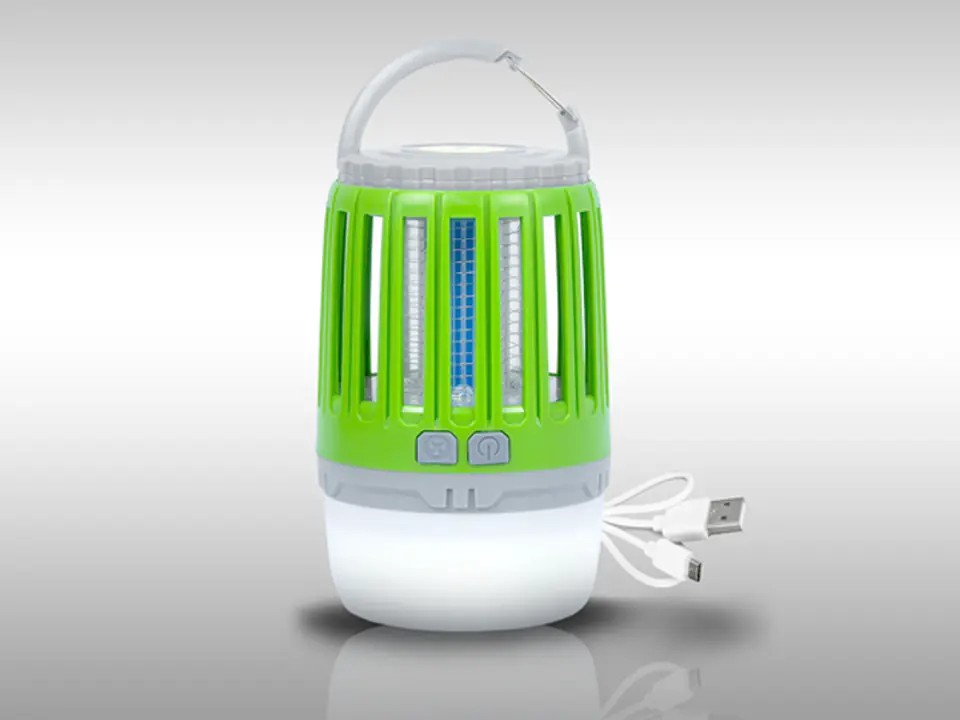 Kompaktowe urządzenie wielofunkcyjne, spełniające funkcję przenośnej lampki zasilanej akumulatorowo oraz lampy owadobójczej.