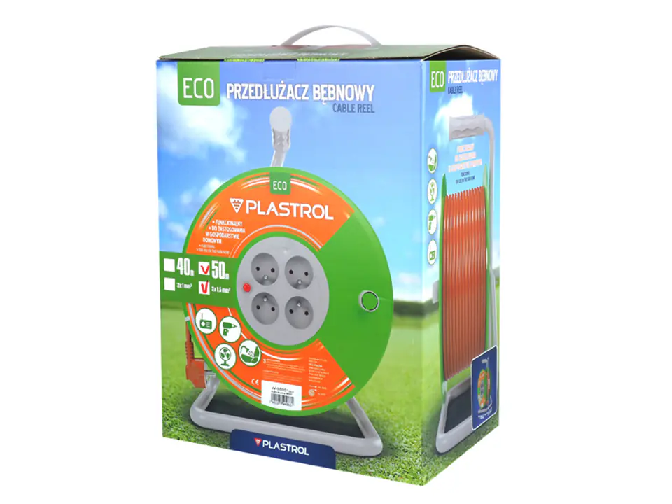 PS PRZEDŁUŻACZ BĘBNOWY ECO LINE, 4X2P+Z, 16A,3680W, PRZEWÓD 3X1,5MM H05VV-F, 50M, POMARAŃCZOWY.
