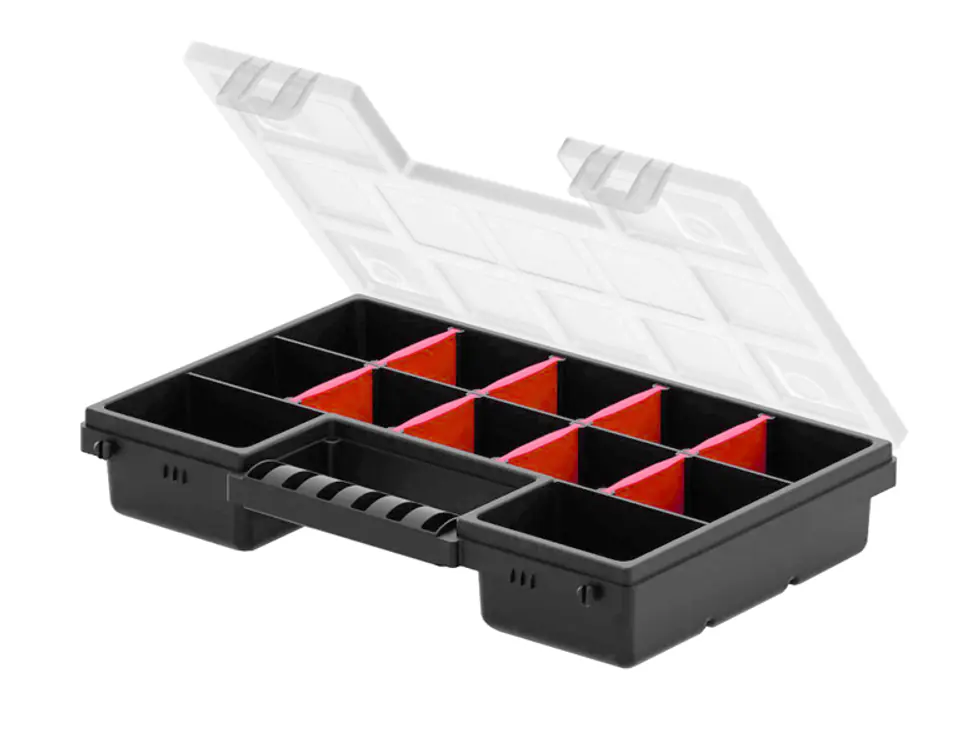 | Wybrane cechy: | 12 wyjmowanych przegród Wytrzymałe zapięcia Przezroczysta pokrywa pozwala szybko zlokalizować szukany element bez konieczności otwierania organizera, Korpus wykonany z mieszanki polimerów o podwyższonej wytrzymałości odporność na uderzenia Ergonomiczny uchwyt Estetyczne i solidne wykonanie |