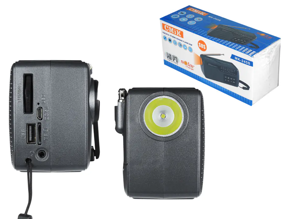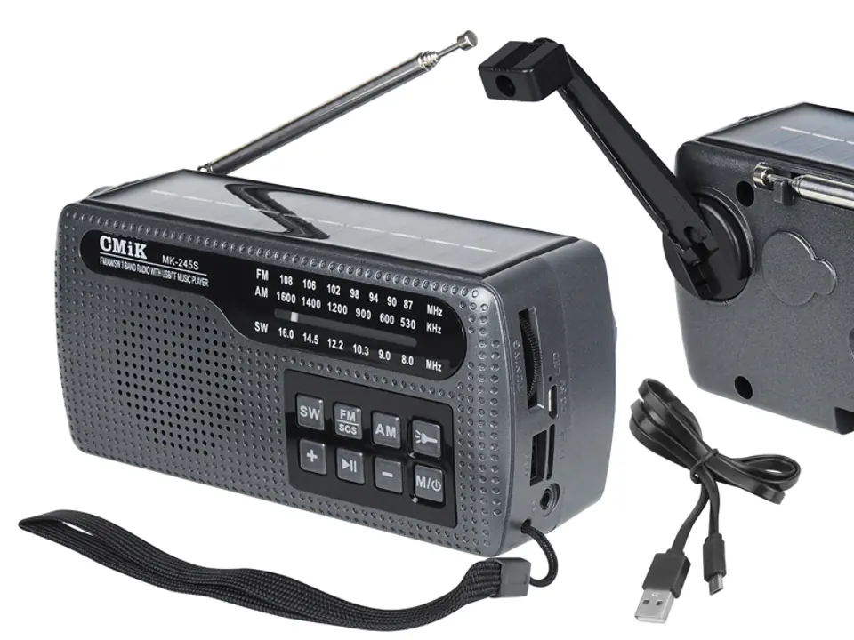 Radio przenośne campingowe MK-245S z panelem solarnym, korbką, USB, microUSB, AUX, latarką