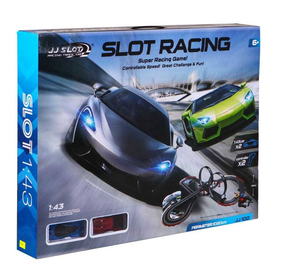 | Duży tor wyścigowy z dwoma autami to gratka dla każdego amatora wyścigów samochodowych. Długość toru to aż 1020 cm, wymiary toru w stanie zmontowanym 190 cm x 168 cm, skala 1:43. Tor zasilany jest z sieci 220V, zasilacz 12V. Podczas jazdy w autkach świecą się przednie światła. Zabawa torem pozytywnie wpływa na koordynację wzrokowo-ruchową dzieci i zapewni im wiele wrażeń: | |
