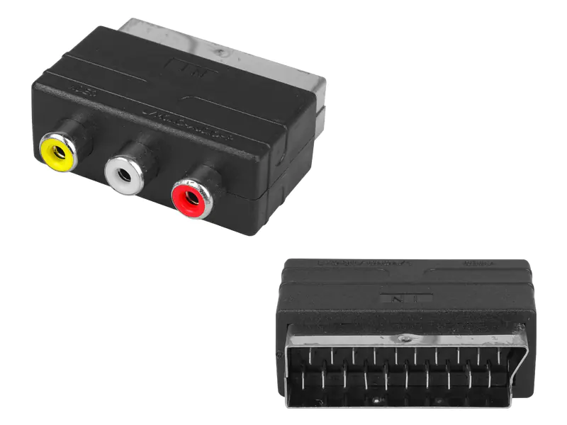 Przejściówka wysokiej jakości umożliwiająca przesłanie sygnału audio/wideo kablami RCA do urządzenia wyposażonego w gniazdo EURO.