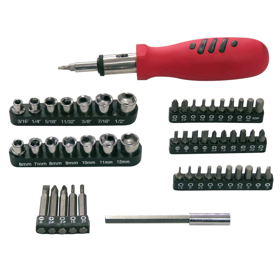 - Nasadki 6, 7, 8, 9, 10, 11, 12 mm, 3/16", 1/4" 5/16", 11/32", 3/8", 7/16", 1/2"