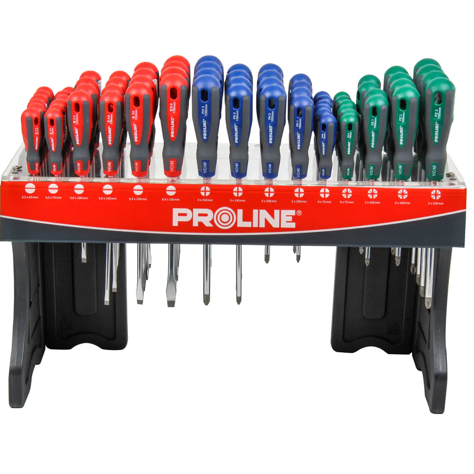 - Stojak z 68 wkrętakami z rękojeścią dwuskładnikową z twardego i miękkiego antypoślizgowego tworzywa