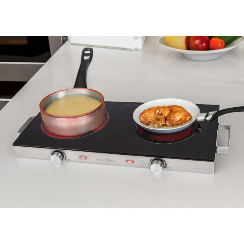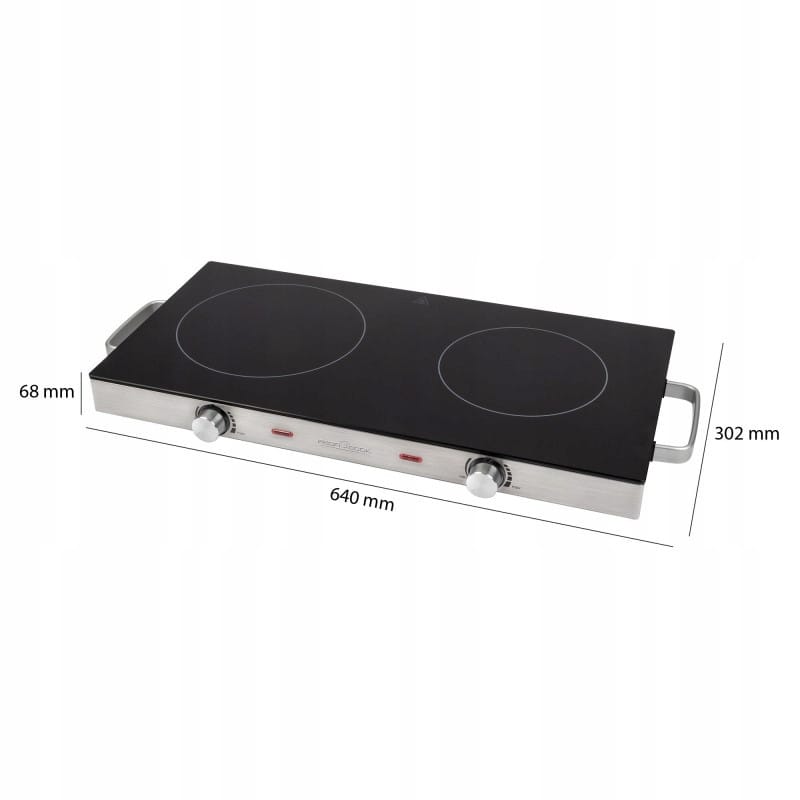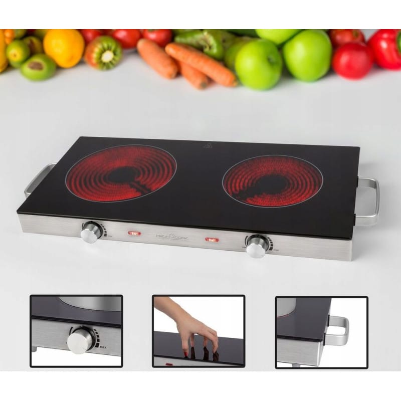 NAJWYŻSZEJ JAKOŚCIKUCHENKA ELEKTRYCZNADWUPŁYTOWA DWUPALNIKOWARENOMOWANEJ FIRMY PROFICOOKMODEL: PC-DKP 1211Przenośna płyta ceramiczna o solidnej obudowie i odpornej na zarysowania szklano-ceramicznej powierzchni.Podczerwień w kuchence to szybkie nagrzewanie i mniejsze rachunki za prąd.Kuchenkę łatwo przenieść dzięki nienagrzewającym się uchwytom, łatwo wyczyścić, dzięki gładkiej płycie.Moc grzania można ustawić pokrętłem do 2800 W.Kuchenka ProfiCook PC-DKP 1211 jest niezastąpiona kiedy potrzebujesz coś ugotować poza domem lub kiedy potrzebujesz więcej palników do gotowania, które na co dzień nie są potrzebne.Przyda się również wtedy, gdy chcesz móc bezpiecznie korzystać z kuchenki, w miejscu, gdzie nie ma na to zwyczajowo miejsca - w akademiku, czy wynajmowanym pokoju.Kuchenka na podczerwień z dwoma polami grzewczymi to idealne rozwiązanie na takie sytuacje.Solidna obudowa, łatwa w czyszczeniu powierzchnia oraz uchwyty, które są chłodne nawet, gdy płyta się nagrzeje. Szybko się rozgrzewa osiągając ustawiony poziom mocy dopasowany do czynności, jaką chcesz wykonać.Pokrętła wykonane ze stali nierdzewnej ustawisz wskazując czynność, którą chcesz wykonać, bez konieczności sterowania temperaturą czy mocą. Oczywiście im dalszy od zera program, tym wyższa temperatura.Tak więc bez problemu ustawiasz pokrętło na poziom najlepszy do: podgrzania, duszenia, smażenia, gotowania czy pieczenia potraw. Maksymalna moc, którą kuchenka osiąga wynosi 2800 W.Dzięki zastosowanej technologii podczerwieni jest wyjątkowo ekonomiczna i efektywna.Szklano-ceramiczna płyta kuchenki jest nie tylko łatwa w czyszczeniu, ale też jest odporna na zarysowania. Dlatego urządzenie to może służyć ci latami.Podwójna płyta grzewcza na podczerwień z wysokiej jakości powierzchnią szklano-ceramicznąTechnologia podczerwieni:Oszczędzanie energiiKrótka faza podgrzewaniaZnacznie szybsze nagrzewanieSzybszy czas reakcjiOdporna na zarysowania gładka powierzchnia do gotowania (bardzo łatwa do czyszczenia)Nadaje się do wszystkich typów garnków, najlepiej z płaskim dnemDwa pola grzewcze o średnicy ok. 170 i 200mmPłynna regulacja temperatury za pomocą pokrętła ze stali nierdzewnejWskaźnik LEDSolidne, izolowane termicznie aluminiowe uchwytyOchrona przed przegrzaniemWysoka stabilność dzięki antypoślizgowym nóżkom220–240 V, 50/60 Hz, 2800 WMoc i energooszczędnośćMaksymalna moc, którą kuchenka osiąga wynosi 2800 W. Dzięki zastosowanej technologii podczerwieni jest wyjątkowo ekonomiczna i efektywna.Wysoka jakośćObudowa kuchenki została wykonana ze stali nierdzewnej Inox wraz ze szklaną, elegancką powierzchnią roboczą.UniwersalnośćKuchenka sprawdzi się poza domem lub jeśli potrzebujesz więcej palników do gotowania. Przyda się również wtedy, gdy chcesz móc bezpiecznie korzystać z kuchenki, w miejscu, gdzie nie ma na to zwyczajowo miejsca - w akademiku, czy wynajmowanym pokoju.Wymiary kuchenki:Wymiary (ok. szer. x wys. x gł.) i wagaUrządzenie: 661 x 68 x 296 mm; 3.6 kgOpakowanie: 684 x 350 x 95 mm; 3.9 kgDługość kabla: ok. 75cmslimtex