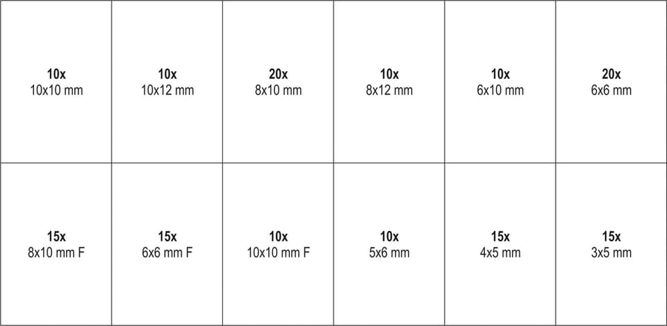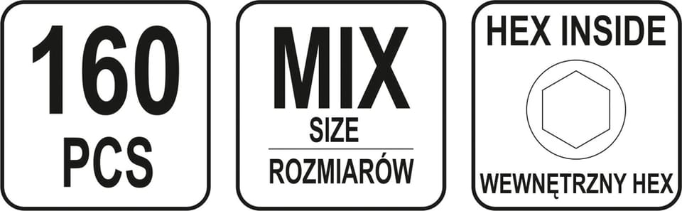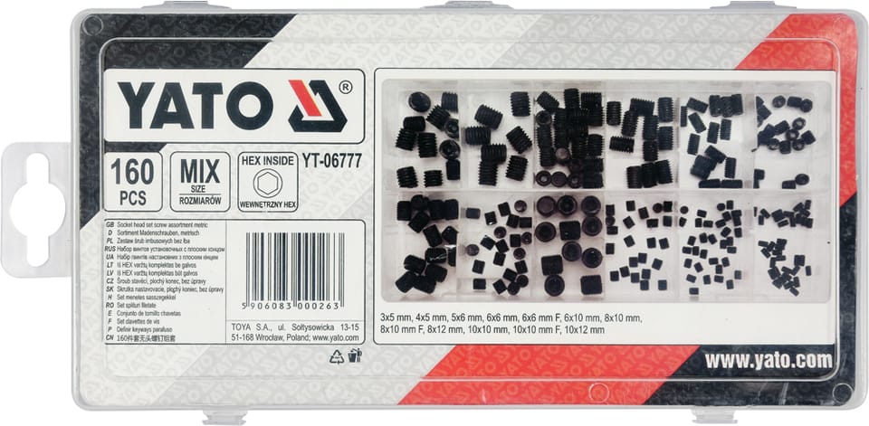 Zestaw 160 sztuk śrub imbusowych bez łba - ustalających. Zestaw zawiera rozmiary od 3x5 mm do 10x12 mm. Całość umieszczono w wygodnym opakowaniu typu "sortownik".