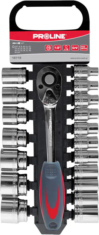 18719 Klucze nasadowe 1/2 cala, zestaw - 19 elementów, CrV, 8-32 mm, Proline