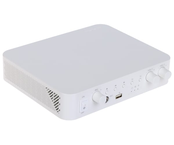 Wzmacniacz DS-QAE0A60G1-VB to wzmacniacz miksujący, czyli wzmacniacz zintegrowany z mikserem, wyposażony w wejście mikrofonowe, 2 wejścia liniowe, odtwarzacz USB oraz interfejs Bluetooth.