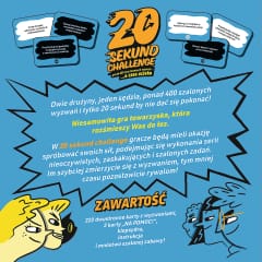 W grze 20 sekund challenge gracze mają szansę spróbować swoich sił, podejmując się wykonania serii nieoczywistych, zaskakujących i szalonych zadań. Im szybciej zmierzycie się z wyzwaniem, tym mniej czasu pozostawicie rywalom. To gra towarzyska, która rozśmieszy Was do łez!