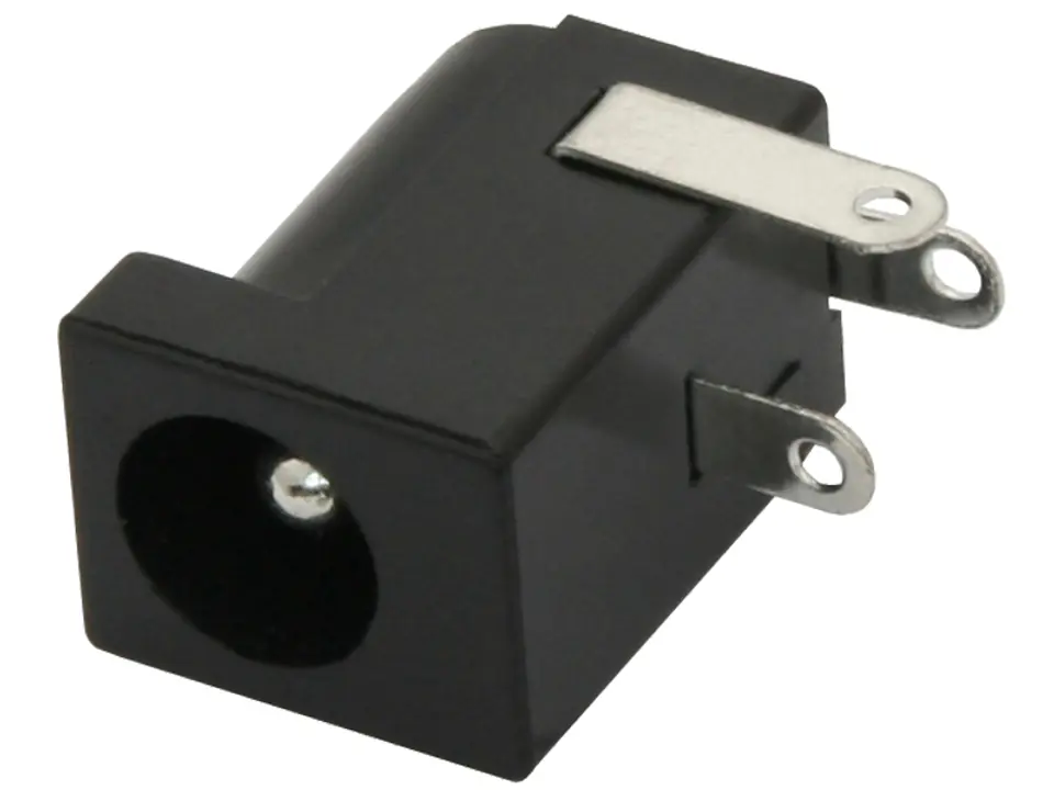 Gniazdo DC 2,5/5,5 z trzema płaskimi stykami, wykonane z plastiku i przeznaczone do montażu.