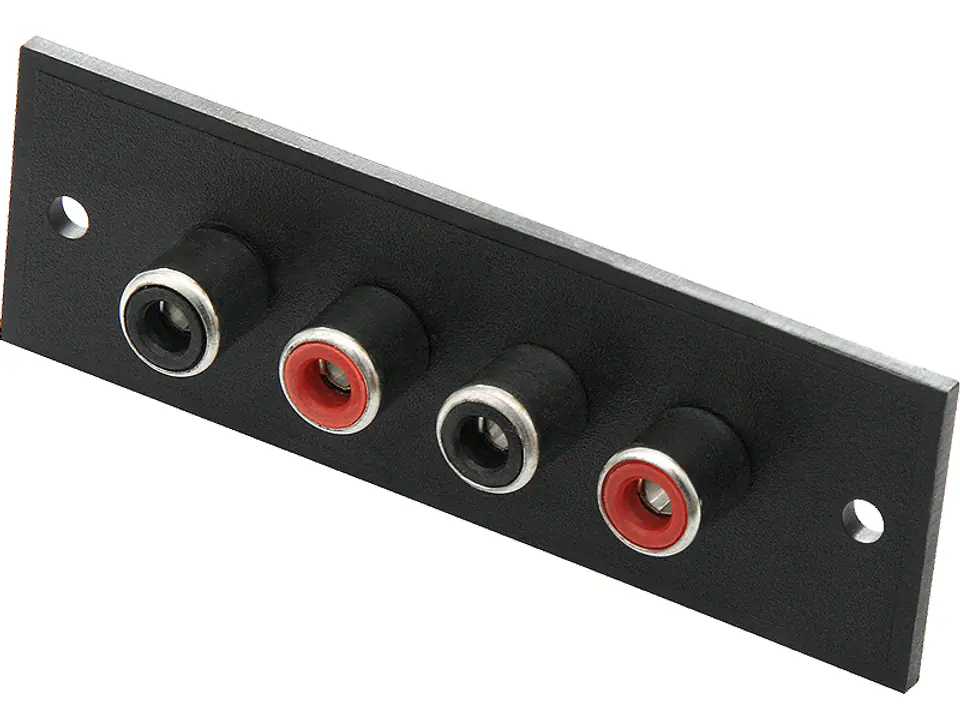 Cztery gniazda RCA, po dwa czarne i po dwa czerwone, na płytce.