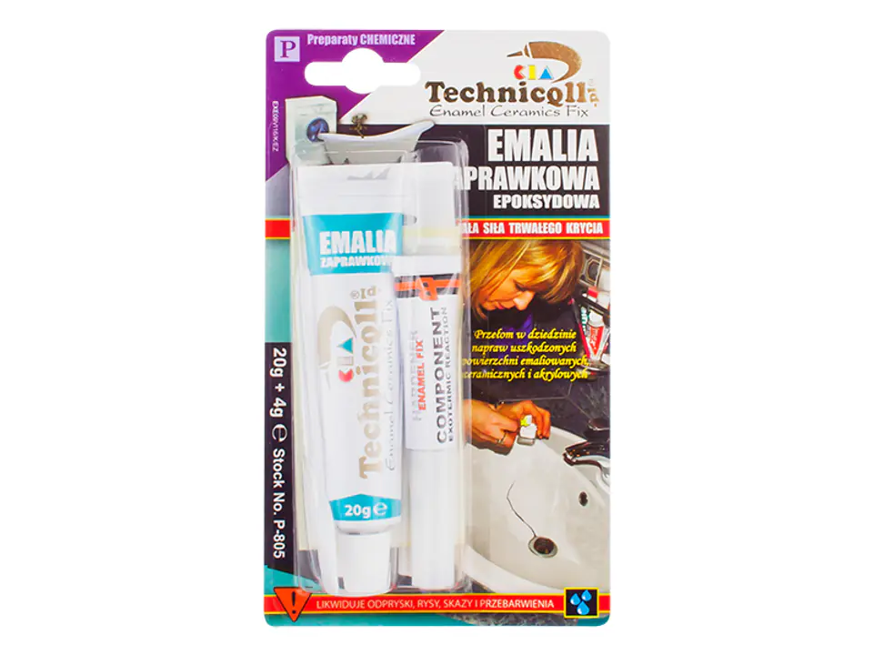 Emalia zaprawkowa na bazie żywicy epoksydowej stosowana do trwałych napraw pęknięć, zadrapać i ubytkw. Służy do szybkiej naprawy białych, o wysokim połysku powierzchni, emaliowanych, ceramicznych, akrylowych i lakierowanych uszkodzonych w wyniku uderzeń, zadrapań, obić jak rwnież skaz i odbarwień. W szczeglności przeznaczona do naprawy elementw emaliowanych, ceramicznych i akrylowych.