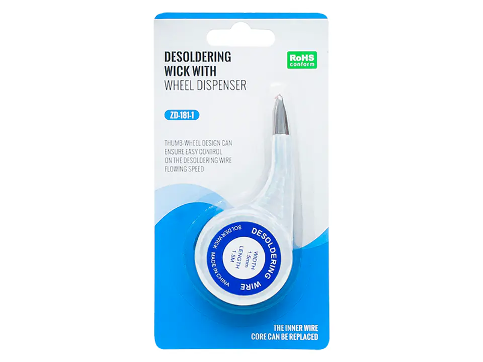 Taśma wykorzystywana głownie jest do odsysania cyny z płytek drukowanych PCB. Idealna jeżeli istniej potrzeba precyzyjnego i dokładnego odessania nadmiaru cyny w miejsca pola lutowniczego. Plecionka została umieszczona w podajniku który ułatwi precyzyjne podawanie drut plecionki.