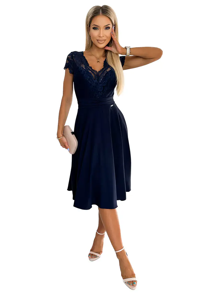Linda - ekskluzywna szyfonowa sukienka z krótkim rękawkiem, koronkowym dekoltem i wycięciem na plecach - granatowa. Produkcja polska. Marka Numoco.