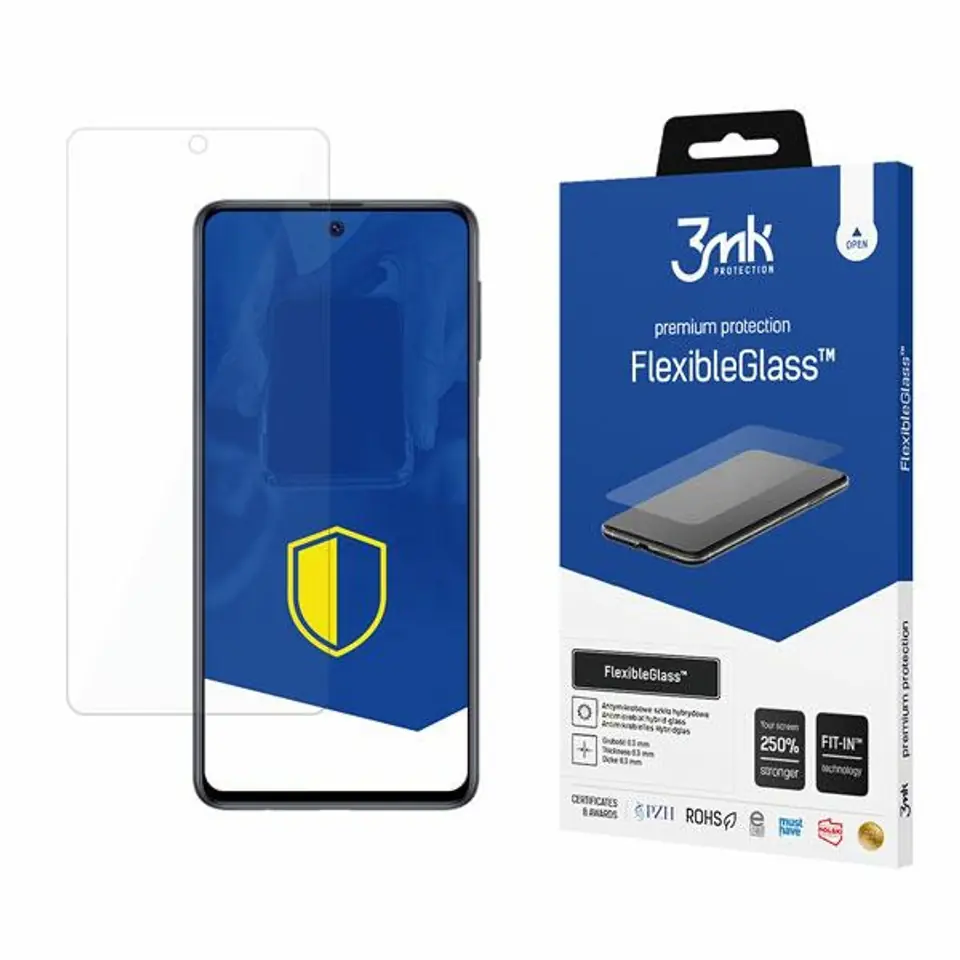 Zestaw zawiera3mk FlexibleGlass™ 1 szt., listki pozycjonujące Fit-In™, listki Dust-Fix™, Anti-Bubble Card™, zestaw do czyszczenia