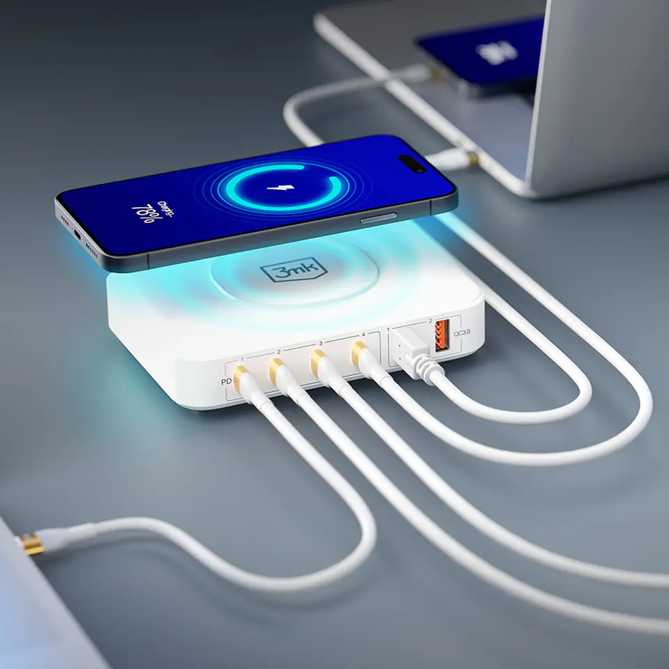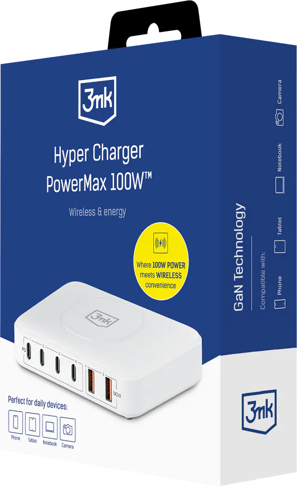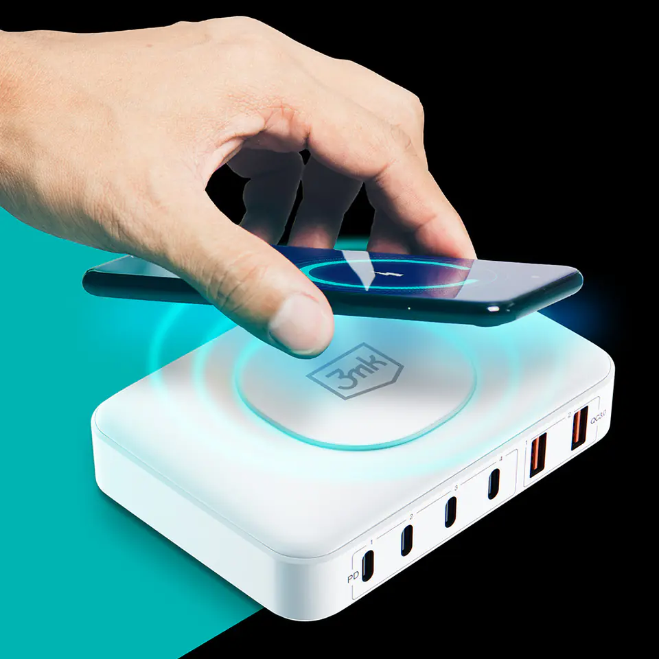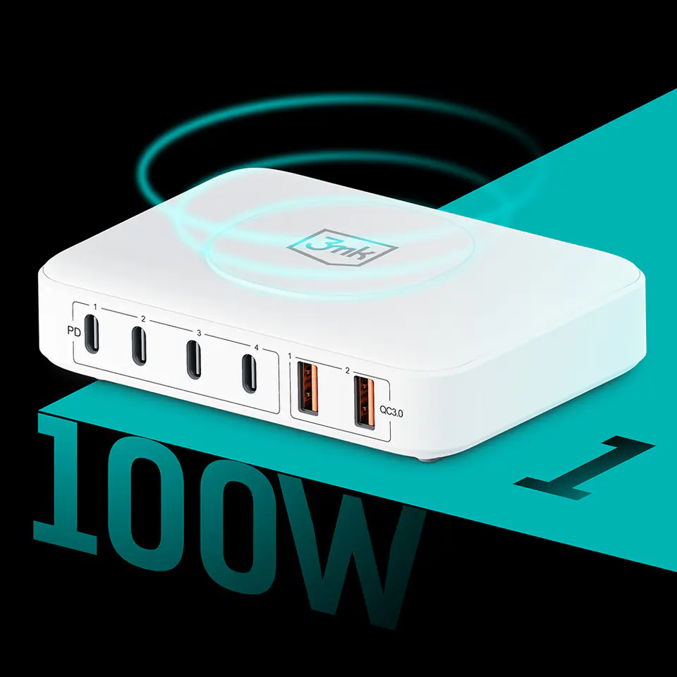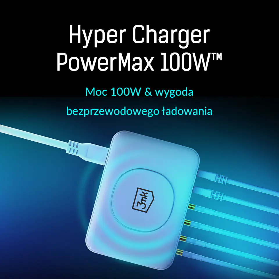 Hyper Charger PowerMax 100W™ jest wyposażona w 4 wejścia USB Type-C oraz 2 wejścia USB-A. Ponadto, ładowarka posiada dedykowane miejsce do ładowania indukcyjnego, aby zapewnić wygodne i wszechstronne ładowanie.