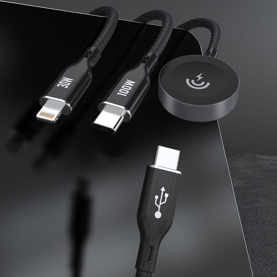 - - Wszechstronność 3w1: Kabel oferuje trzy różne złącza: ładowarka bezprzewodowa, USB-C oraz Lightning, co pozwala na ładowanie różnych urządzeń – od telefonów, przez tablety, po Apple Watch.