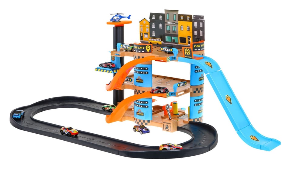 4-piętrowy parking z windą dla dzieci 3+ Autka helikopter + zjeżdżalnia