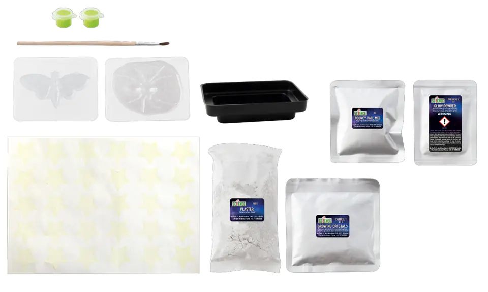- W zestawie znajdują się 2x małe pojemniki, świecącej w ciemności farby - 2x odlewy insektów - Instrukcje - Zielony, okrągły przyrząd do tworzenia piłeczek świecących w ciemnościach - Świecące gwiazdki