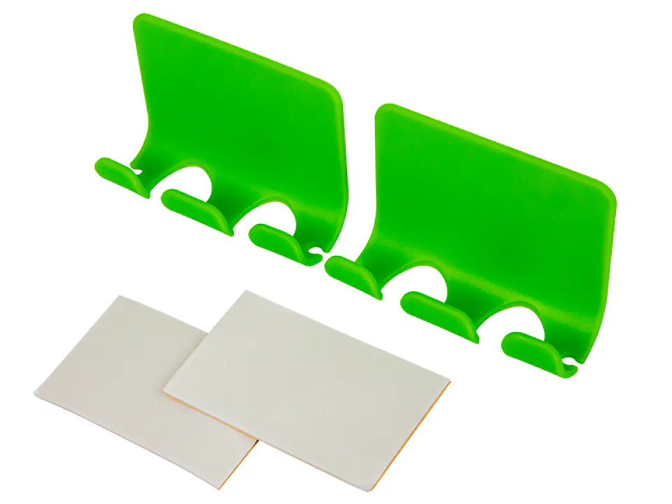 Organizer kabli w postaci uchwytu ładowarki w kolorze zielonym. Produkt umożliwia łatwe łączenie i uporządkowanie kilku przewodów, kabli i pasm w jeden pakiet. Wykonany z elastycznego, odpornego na uszkodzenia tworzywa sztucznego.