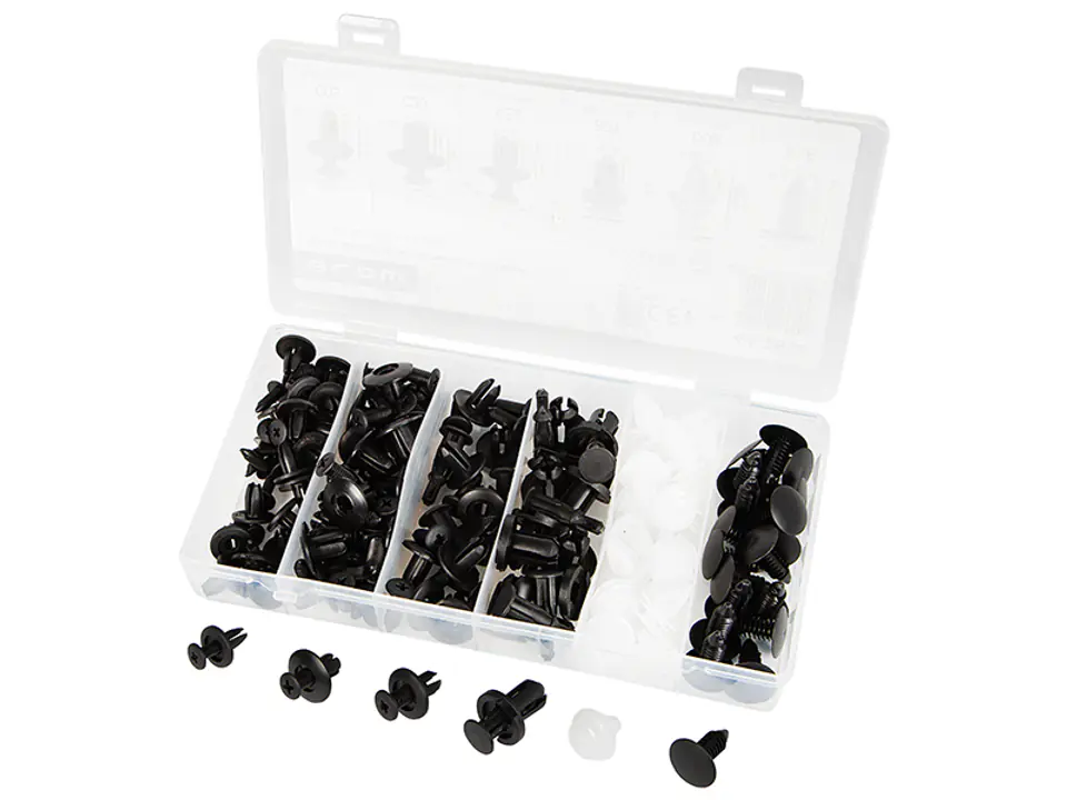 Uniwersalny zestaw 100 sztuk różnych spinek, kołków, zatrzasków samochodowych do mocowania.