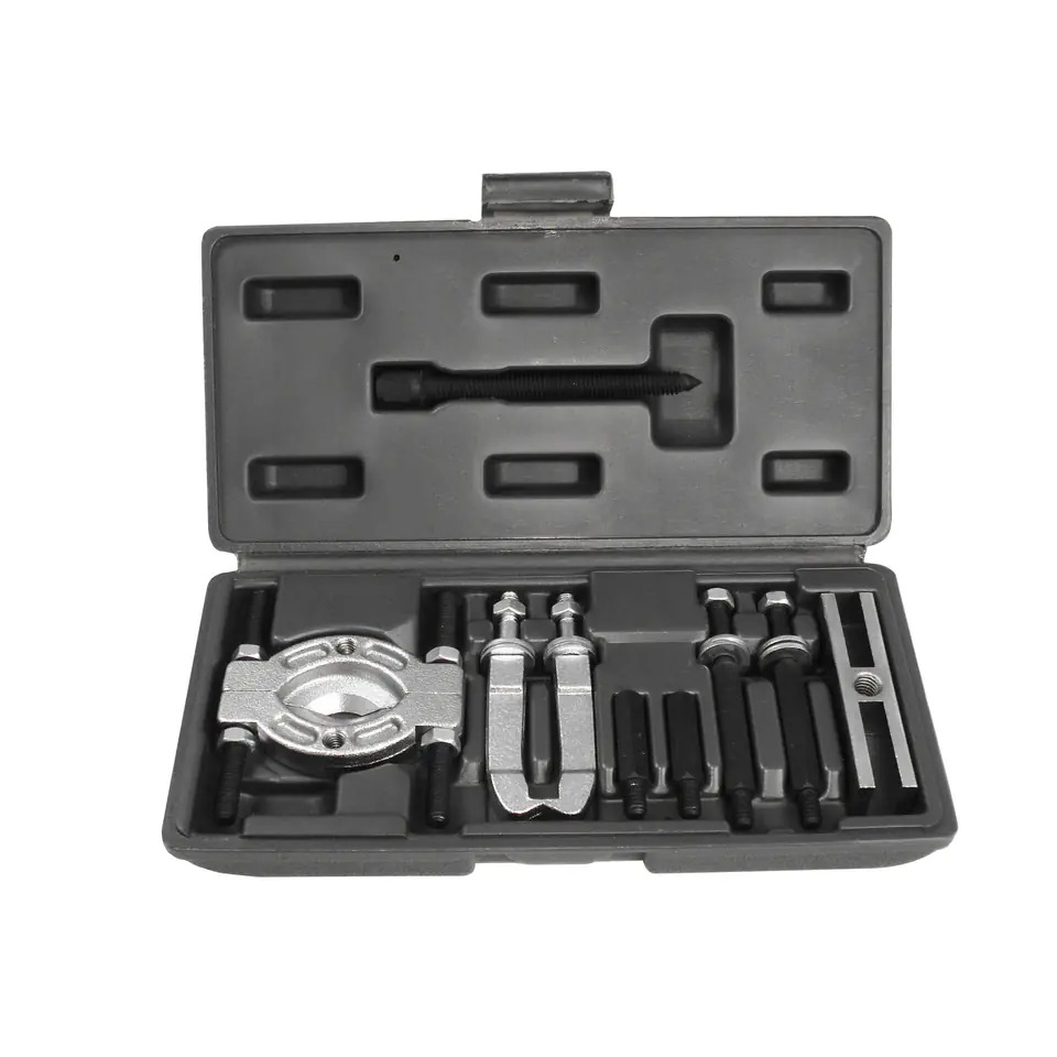 Ściągacz uniwersalny do łożysk i separator przeznaczony jest do intensywnej pracy w serwisach i warsztatach samochodowych. Ściągacz dwuramienny to narzędzie ułatwiające demontaż kół zębatych, łożysk, tarcz hamulcowych oraz innych elementów ciasno pasowanych. Ściągacz wykonany jest ze stali wysokowęglowej, posiada oksydowane ramiona oraz chromowane łapy w dwóch rodzajach. Łapy ściągacza uniwersalnego różnią się wielkością stopki, co powoduje, że ściągacza można użyć do demontażu elementów o różnej wielkości. Napadem ściągacza jest śruba o trapezowym, drobnozwojnym gwincie, wyposażona w 2 rodzaje końcówek: stożek oraz końcówkę płaską.