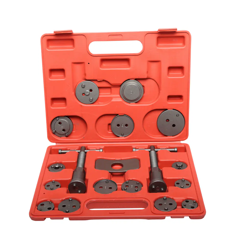 - Profesjonalny, duży, 18 elementowy zestaw do cofania / wyciskania tłoczków w cylinderkach układów hamulcowych, niezbędny przy naprawach pojazdów wyposażonych w hamulce tarczowe