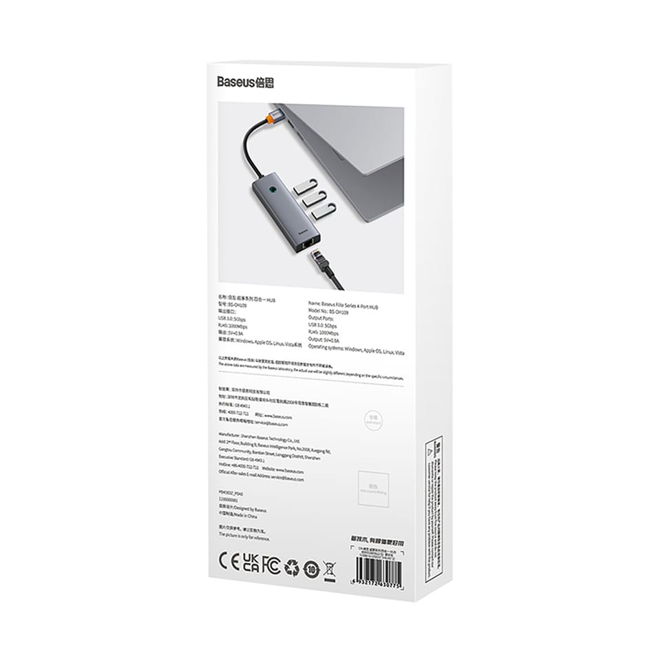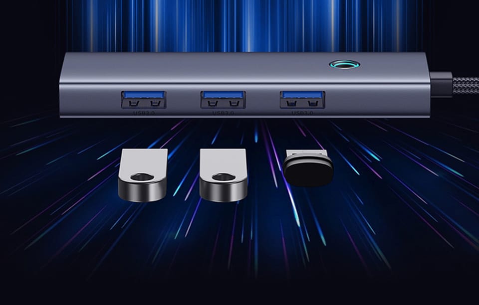 Kod produktu: 1030284Hub Baseus UltraJoy 4w1 to kompaktowe i funkcjonalne rozwiązanie, które pozwala błyskawicznie rozszerzyć możliwości Twojego laptopa lub komputera. Trzy porty USB-A 3.0 umożliwiają szybki transfer danych z prędkością do 5 Gb/s, natomiast port RJ45 zapewnia stabilny dostęp do Internetu z prędkością do 1000 Mb/s. Urządzenie jest niezwykle lekkie i poręczne - waży tylko 70 g i zmieści się w każdej torbie. Niezależny przycisk do wygaszania ekranu chroni Twoją prywatność podczas prezentacji czy pracy w miejscach publicznych. Aluminiowa obudowa oraz uniwersalna kompatybilność sprawiają, że to niezbędne akcesorium do biura, podróży i pracy zdalnej.Najważniejsze cechy: