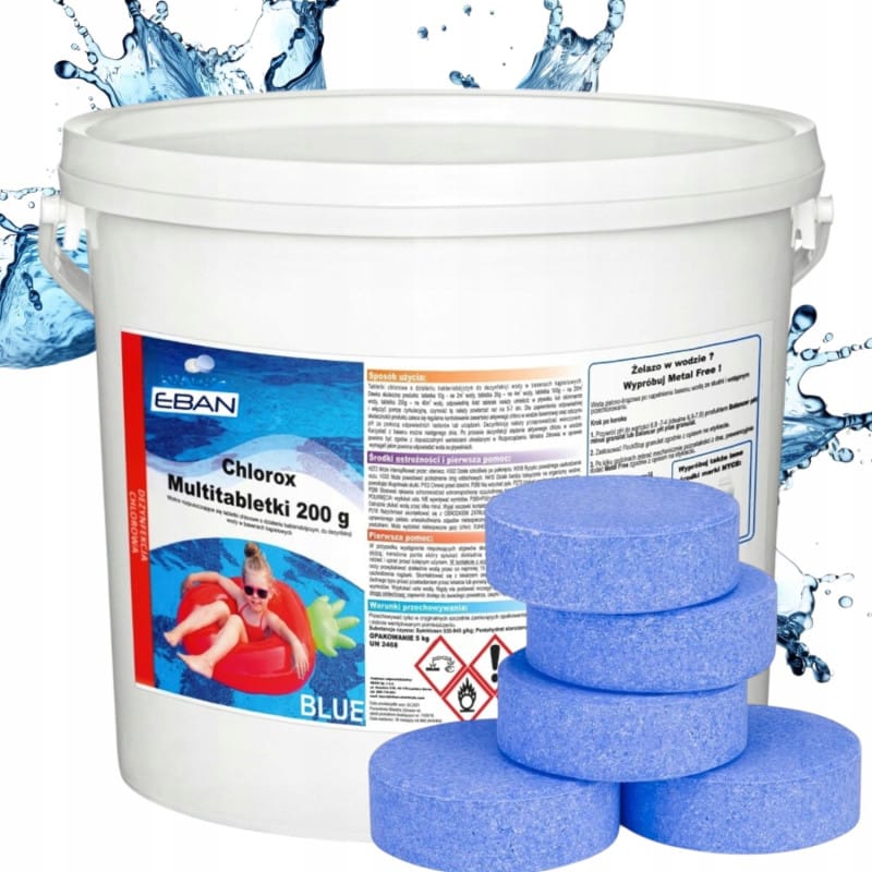 Produktów biobójczych należy używać z zachowaniem środków ostrożności.Przed każdym użyciem należy przeczytać etykietę i informacje dotyczące produktu.PROFESJONALNA CHEMIA BASENOWA NTCENTCE TABLETKI MULTIFUNKCYJNE 15w1CHLOR DO BASENU, JACUZZI, SPA200g - opakowanie 5 kg - otrzymujesz 25 szt tabletek 200g NIEBIESKIE TABLETKI PRODUKT POLSKI Tabletki multifunkcyjne do basenu to niezastąpiony produkt, który pozwala utrzymać wodę w Twoim basenie czystą i świeżą przez długi czas.Dzięki wielofunkcyjnej formule, te tabletki nie tylko oczyszczają wodę z zanieczyszczeń, ale także dbają o odpowiedni poziom chloru, zapobiegają rozwojowi glonów, a także poprawiają jakość wody, sprawiając, że kąpiel staje się przyjemnością.TABLETKI WOLNO ROZPUSZCZAJĄCE SIĘ O DZIAŁANIU BAKTERIOBÓJCZYMDO DEZYNFEKCJI WODY TABLETKI 15w1 - JEDYNE TAKIE NA ALLEGRO 1. Funkcje chemiczneTo wszystko, co dzieje się na poziomie reakcji chemicznych:Dezynfekcja – niszczy bakterie, wirusy, glony.Neutralizacja zanieczyszczeń organicznych – chlor rozkłada mocz, pot, kosmetyki.Stabilizacja chloru – chroni go przed słońcem (UV).Zbijanie fosforanów – ogranicza pożywkę dla glonów.Bufor pH – utrzymuje stabilne pH.2. Funkcje fizyczneTo efekty, które są zauważalne w wyglądzie lub właściwościach wody:Przejrzystość wody – eliminuje mętność.Działanie flokulacyjne – zbija drobne cząstki.Zmiękczanie wody – mniej kamienia.Zapobieganie pienieniu – woda bez piany.Usuwanie nieprzyjemnych zapachów – koniec z „basenowym” zapachem chloramin. 3. Funkcje praktyczneCzyli wygoda i użyteczność dla właściciela basenu:Długotrwałe działanie – wolne uwalnianie chloru.Działanie natychmiastowe i opóźnione – szybka i ciągła dezynfekcja.Wielofunkcyjność – jeden produkt = wiele efektów.Łatwe dozowanie (tabletki) – bez codziennego sprawdzania.Bezobsługowe utrzymanie – idealne na wyjazd lub dla leniwych Nasz produkt posiada stwierdzone działanie bakteriobójcze.Niszczy patogeny takie jak Escherichia coliPseudomonas aeruginosaStaphylococcus aureusEnterococcus hiraeLegionella pneumophilaCandida albicansAspergillus NigerDokładne dawki i czasy potrzebne do uzyskania efektu biobójczego dla powyższych szczepów podane są na etykiecie produktu.Dozowanie: Jeżeli zawartość aktywnego chloru przekracza wartość 0,5 mg/ dm3 nie należy wtedy korzystać z basenu. Obniżyć dawkę chloru i poczekać, aż ta wartość spadnie do wyznaczonego zakresu. Można również obniżyć zawartość aktywnego chloru przy pomocy dezaktywatora chloru. Zawartość aktywnego chloru w wodzie basenowej oraz odczyn pH należy sprawdzać regularnie przy pomocy odpowiednich testów do pomiaru tych parametrów. Całkowita dawka aktywnego chloru nie powinna przekraczać 0,5mg/dm3 wody basenowej w chwili użytkowania jej przez ludzi Dawka skuteczna produktu: tabletka 200g – na 40m3 wody Niebieski kolorant - pogłębia błękitny odcień wody. Nadaje wodzie niebieski odcień! BEZPIECZEŃSTWO Produktów biobójczych należy używać z zachowaniem środków ostrożności. Przed każdym użyciem należy przeczytać etykietę i informacje dotyczące produktu.Należy unikać: wdychania, kontaktu ze skórą, oczami oraz spożywania. W wypadku narażenia postępować zgodnie z instrukcją na etykiecie produktu.Niebezpieczny dla środowiska w szczególności organizmów wodnych.Produkt należy przechowywać w oryginalnym opakowaniu, w chłodnych i przewiewnych pomieszczeniach z dala od substancji utleniających, kwasów i substancji łatwopalnych. Opakowanie powinno być wyraźnie oznakowane. Chronić przed wilgocią i kontaktem z innymi substancjami.Temperatura składowania 5 - 25°C.