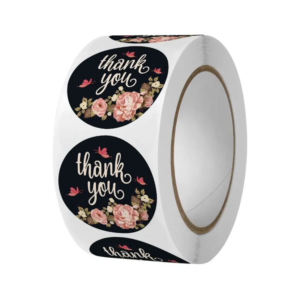 500 sztuk naklejek THANK YOU na taśmie NNK13Naklejki ozdobne, etykiety samoprzylepneCena za zestaw 500 naklejek - rolka Dane produktu:Wymiar naklejek: koło 25 x 25 mmWaga: 48gMateriał: papierowe
