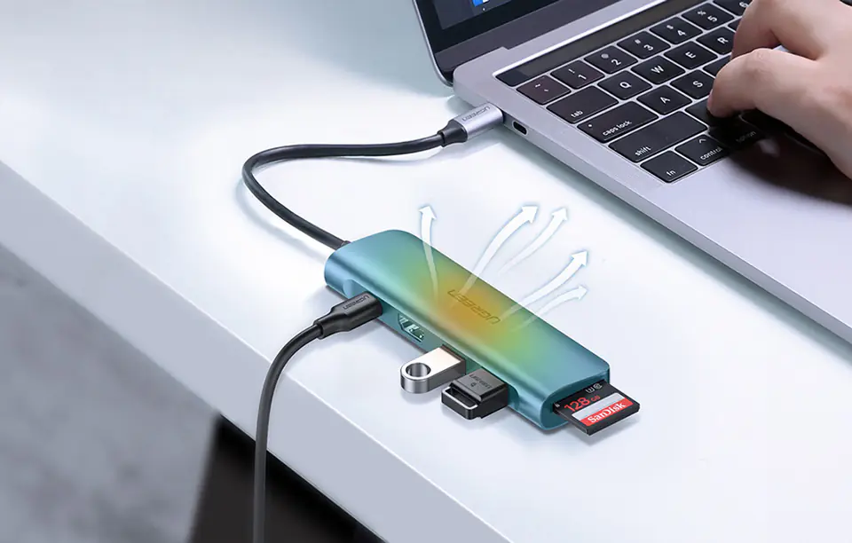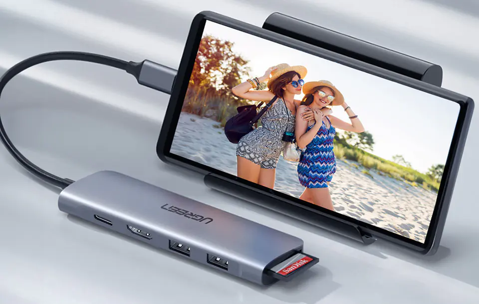 - - Umożliwia podłączenie sześciu urządzeń jednocześnie. Posiada 2 porty USB-A 3.0, USB-C, HDMI oraz czytniki kart SD i TF.