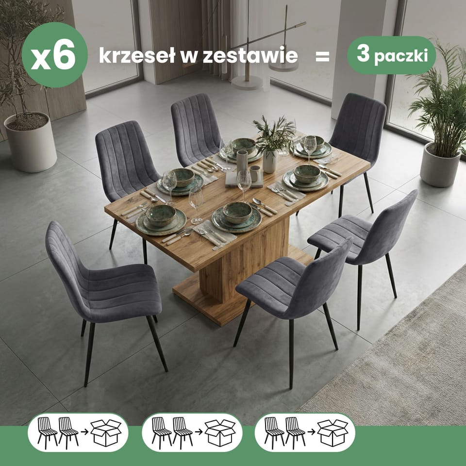 6x Welurowe krzesło tapicerowane pikowane Ciemny Grafit LIVO Czarne nogi