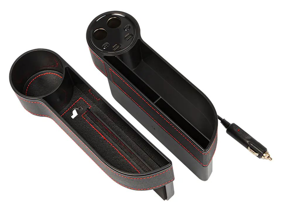 W przedniej części schowka zostały wmontowane dwa gniazda zapalniczki wraz z włącznikami, dwa wejścia USB oraz czytelny wyświetlacz LCD na którym pojawia się informacja o napięciu akumulatora samochodowego. W dalszej części wciąż znajduje się dedykowane miejsce wraz z przegrodami na nasze rzeczy osobiste.