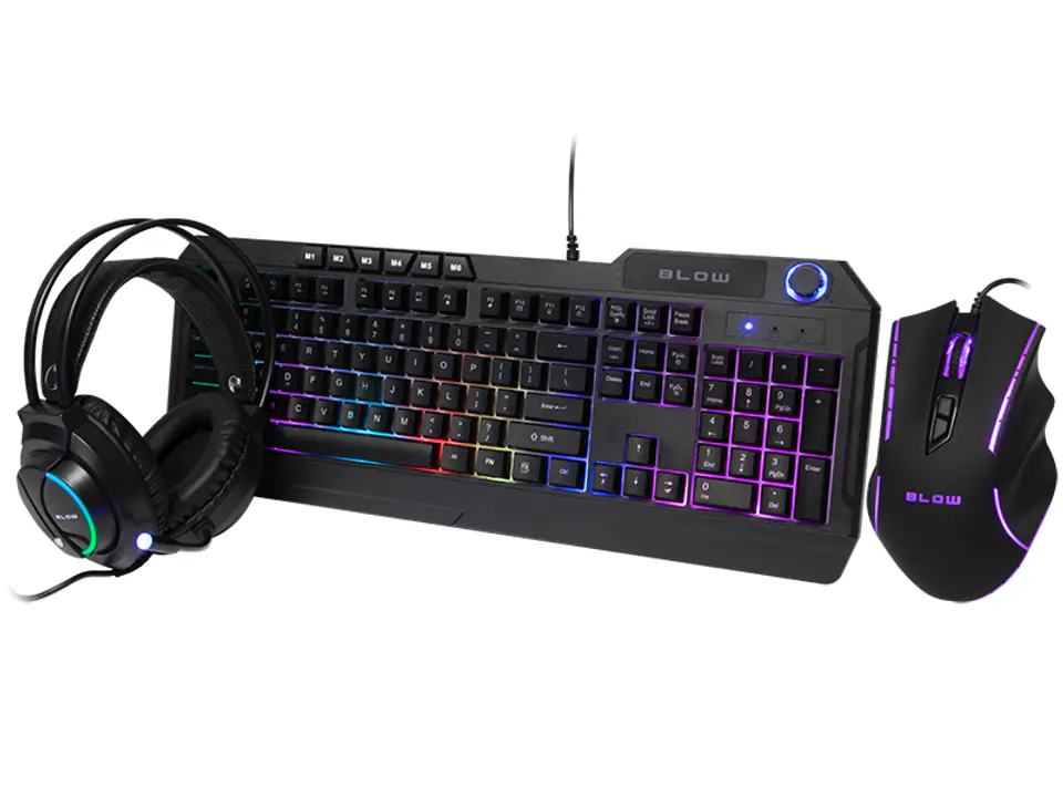 Zestaw marki BLOW składający się z podświetlanej klawiatury, myszki z 5 przyciskami i rolką oraz słuchawek. Zestaw stworzony głównie z myślą o graczach komputerowych którzy cenią sobie przede wszystkim prostotę w połączeniu z nowoczesnością oraz bardzo eleganckie podświetlenie LED zapewniające jeszcze lepsze wrażenia podczas pasjonujących rozgrywek.