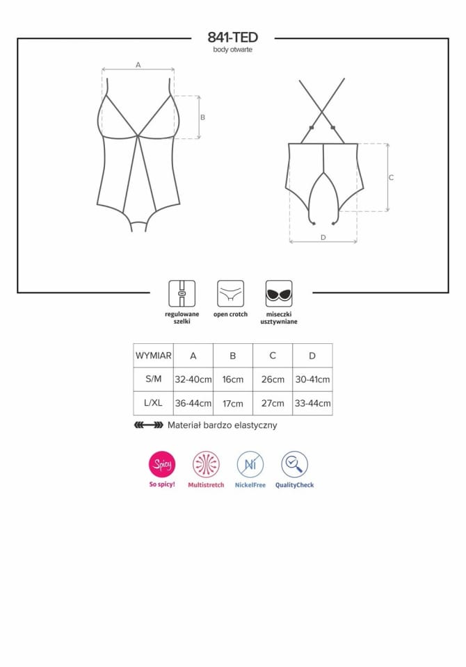 Jeśli masz czasem ochotę na odrobinę pikantnych smaczków… mamy dla Ciebie idealne rozwiązanie! Body o specjalnym kroju stworzonym do rozkosznych eksperymentów we dwoje. Co Cię czeka? Kuszący fason połączony z pełną wygodą noszenia – by było po prostu cudownie! Spróbuj!Spodoba Ci się w 100%. Zobacz:- pikantne body wykonane z prześwitującej siateczki i zdobiącej ciało koronki- regulowane szelki krzyżujące się na plecach – dla idealnego dopasowania i seksownego wyglądu- delikatnie usztywniane miseczki – lekko uniesione, pięknie podkreślone piersi- biżuteryjne ozdoby (NickelFree – bez niklu, bez obaw o alergię) na zakończeniach szelek i pod biustem- figlarne kokardki – z przodu i… nad odkrytymi pośladkami!- niegrzeczny, otwarty krok z regulowanymi paseczkami- miłe w dotyku, elastyczne i świetnie dopasowujące się materiały (94% poliamid, 6% elastan)