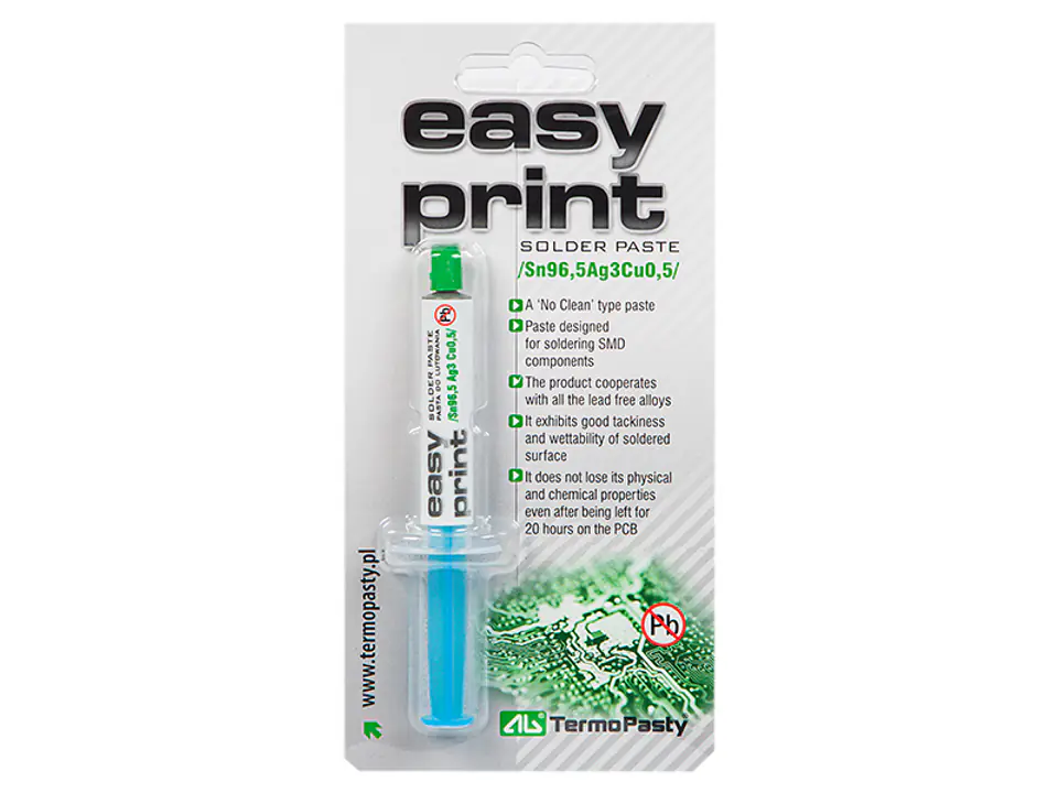 Easy Print Sn96.5Ag3Cu0.5 firmy AG Termopasty to pasta przeznaczona do lutowania elementów SMD w procesach produkcyjnych nie uwzględniających faz mycia. Oparta na bazie topnika typu No Clean, nie wymagającego zmywania, którego pozostałości nie powodują ognisk korozji. Produkt współpracuje ze wszystkimi stopami bezołowiowymi, charakteryzuję się dobrą przylepnością i zwilżalnością lutowanej powierzchni. Nie traci swoich właściwości fizykochemicznych nawet po 20 godzinach pozostawienia go na płytce PCB.