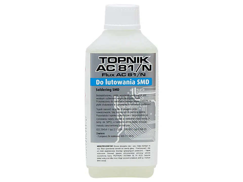 Bezkalafoniowy, ciekły, wysokoaktywny topnik typu 2.1.2/3 A jest wodnym roztworem związków organicznych. Przeznaczony do nakładania ciekłego stopu Sn60/Pb na płytki drukowane w cynowarkach rolkowych (rolltinner).