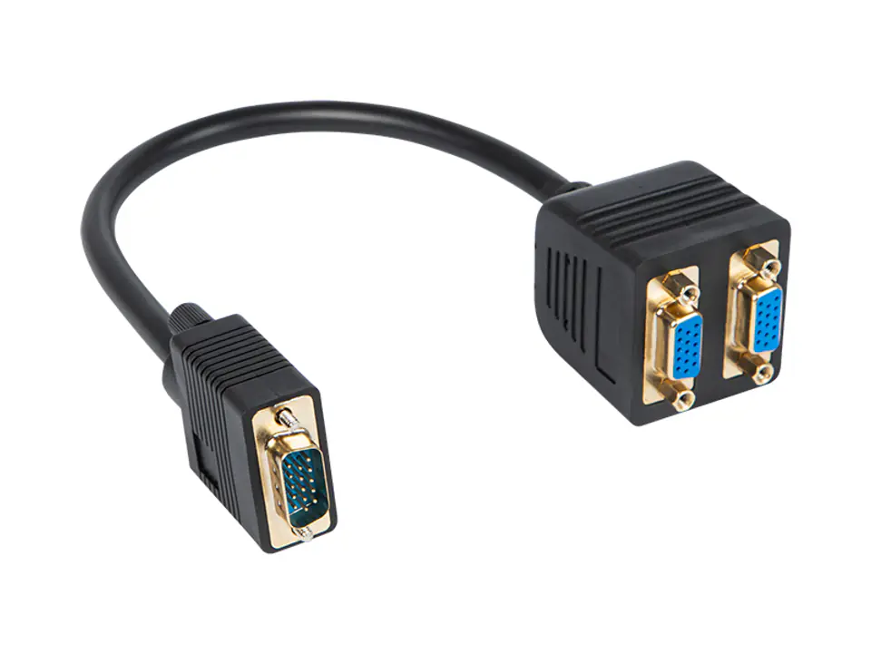 Rozgałęźnik z krótkim przewodem z wtykiem VGA oraz dwoma gniazdami VGA.