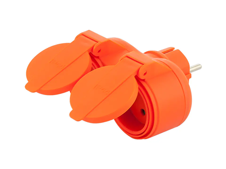 Podwójny rozgałęźnik z klapkami ochronnymi, idealny do zastosowania wewnątrz i na zewnątrz budynków.